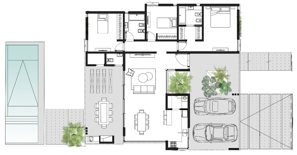 La casa Base no incluye piscina, parquizado, ni riego automático.
