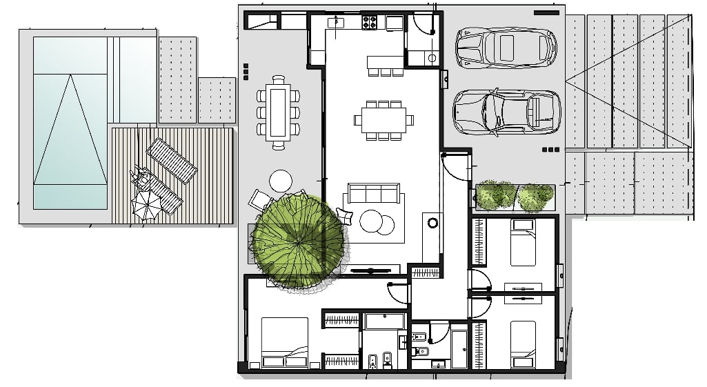 La casa Base no incluye piscina, parquizado, ni riego automático.